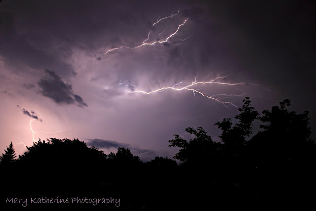 I thought I'd tell you how I took them since it took my almost an hour before I got the right settings. The above pictures were taken with a 4 second shutter speed and an 100 ISO. I don't have a tripod so I set it up on a chair on our front porch and then just kept clicking the shutter button every 4 seconds and hoped lightning would streak across the sky during the 4 seconds and it did several times!